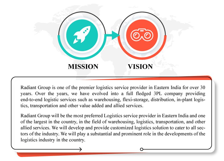Radiant Group is one of the premier logistics service provider in Eastern India for over 30 years. Over the years, we have evolved into a full-fledged 3PL Company providing end-to-end logistic services such as Warehousing, Flexi Storage, Distribution, Transportation, In-Plant Logistics, and other value-added and allied services. We have a world-class infrastructure with a highly motivated and experienced team of professionals.